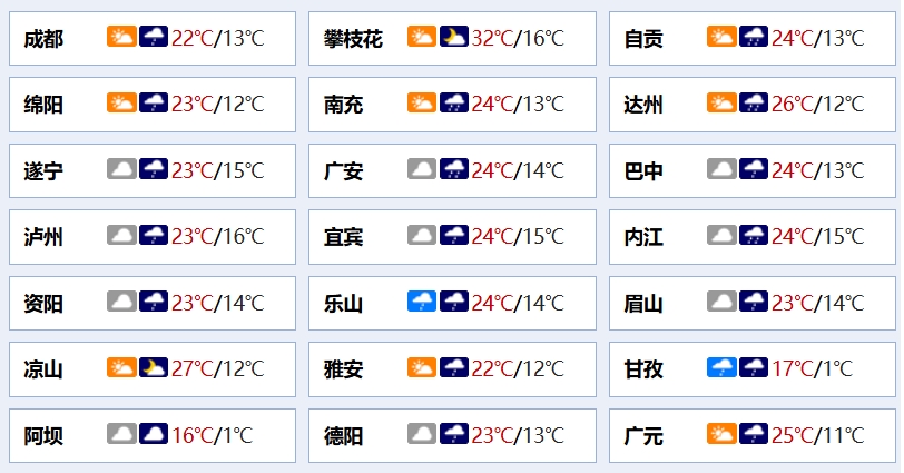 今天白天:盆地大部多云间晴,西南部有阵雨;甘孜州大部和凉山州北部多云间阴有分散阵雨(雪)或雷雨,阿坝州和攀西地区其余地方晴间多云。